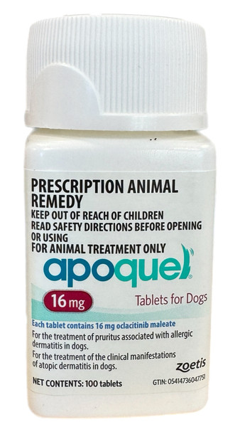 Apoquel 16mg is indicated for the control of pruritus associated with allergic dermatitis and the management of atopic dermatitis in dogs aged 12 months and older. Use strictly under the direction of an Australian-registered veterinarian.